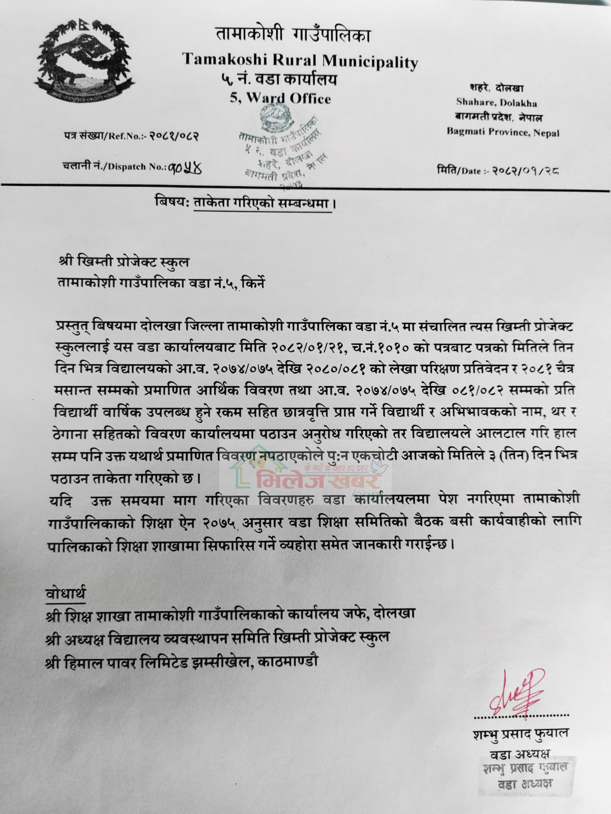 अभिभावकको गुनासोको आधारमा वडा अध्यक्ष शम्भु फुयाँलले २०८२ वैशाख २१ गते ३ दिनको समय दिएर विद्यालयको लेखा परिक्षण प्रतिवेदन, छात्रवृत्ति वितरणको विवरणसहितका आर्थिक विवरण माग गरेर पत्र पठाउनुभयो । कुनै विवरण नआएपछि वडा अध्यक्ष फुयाँलले पुनः वैशाख २८ गते ताकेता पत्र पठाउनुभयो । तर यो समाचार तयार गर्दै गर्दा २०८२ जेष्ठ १५ गतेसम्म पनि कुनै उत्तर नआएको वडा अध्यक्ष फुयाँलले भिलेज खबरलाई जानकारी दिनुभयो ।